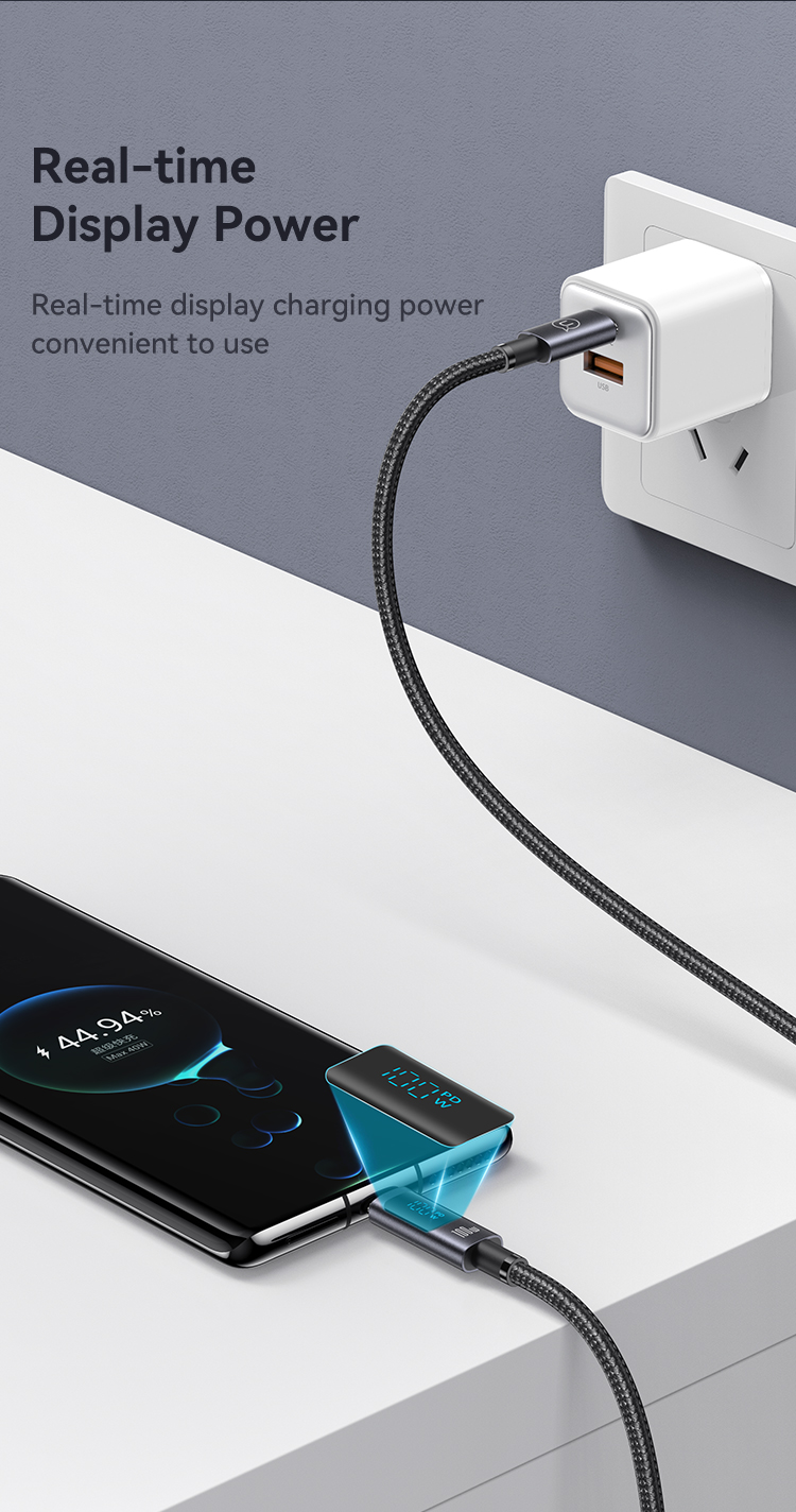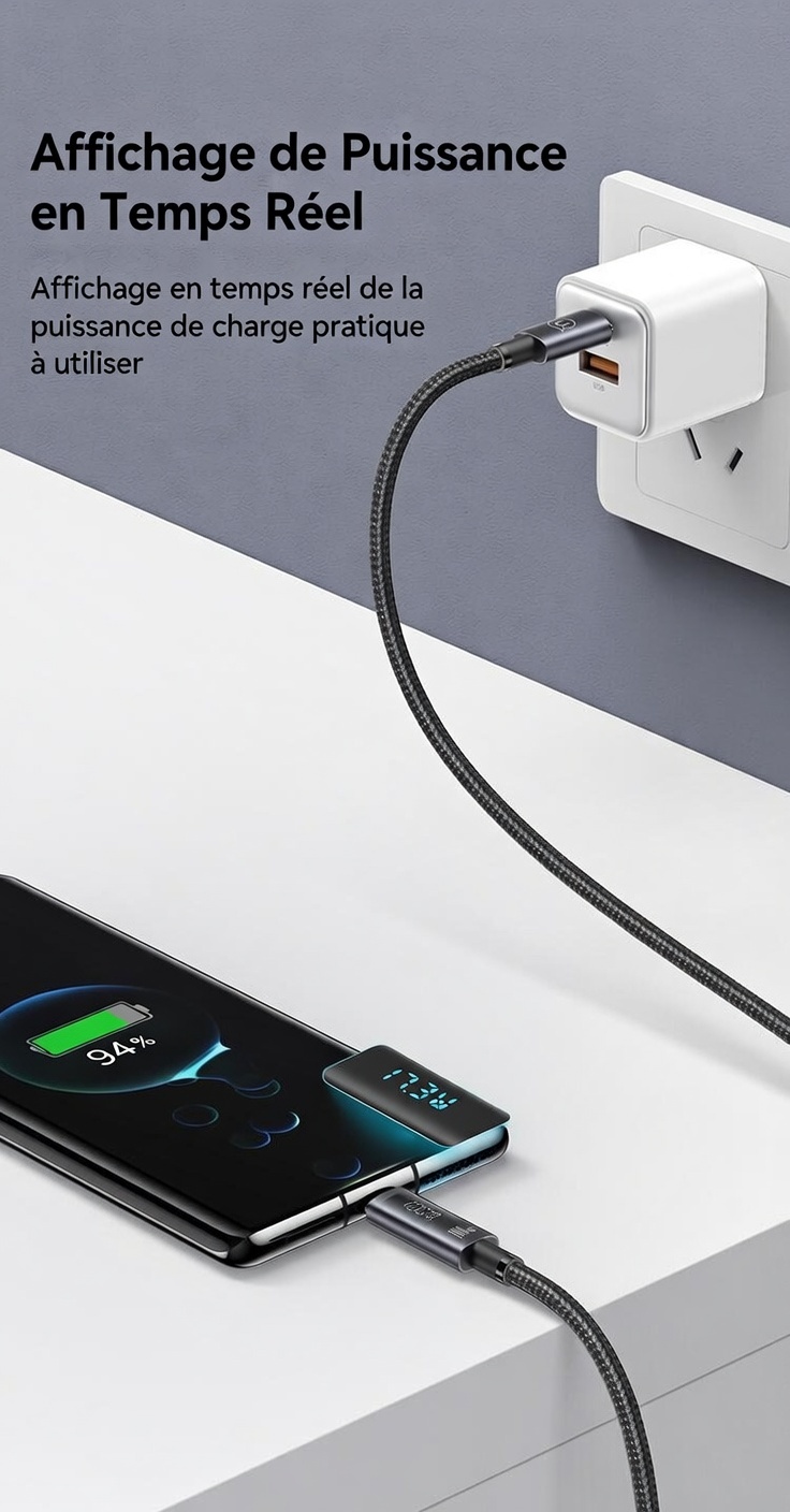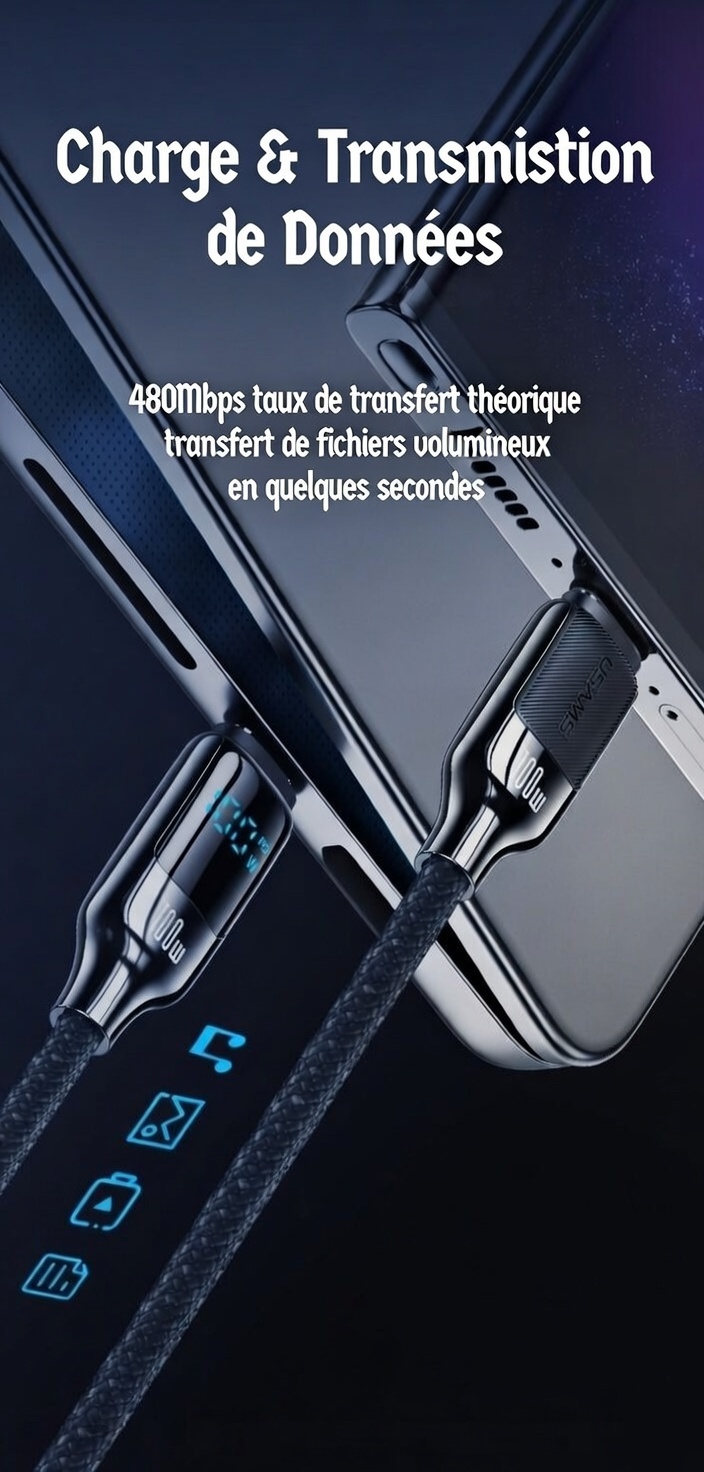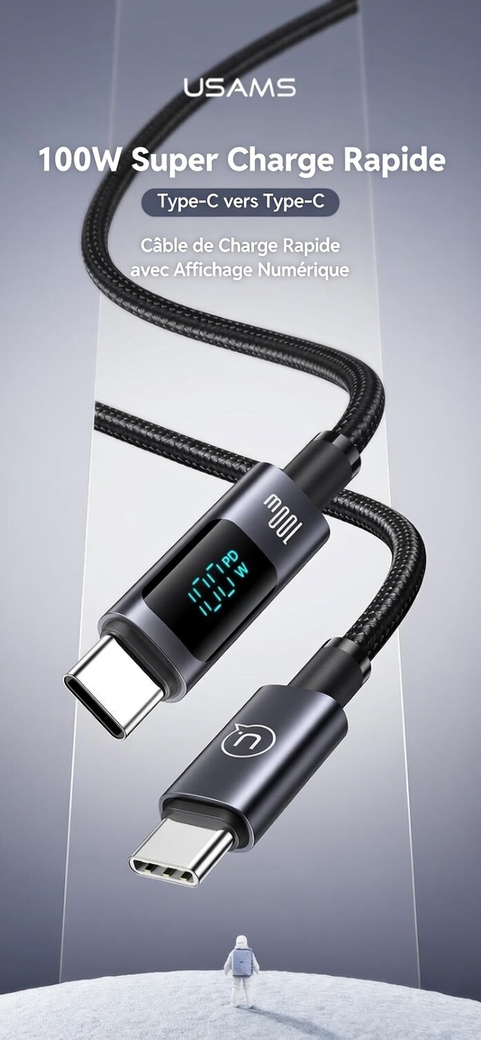 Câble de charge rapide et de transfert de données US-SJ671 USB-C vers USB-C 100 W en alliage d’aluminium avec affichage numérique – Série Sufeng 1,2 m