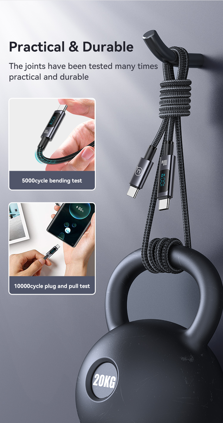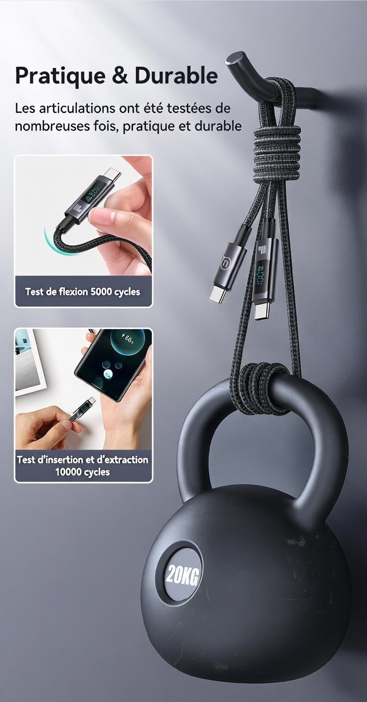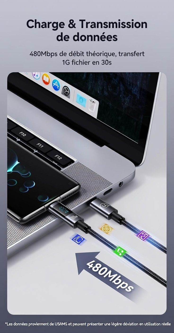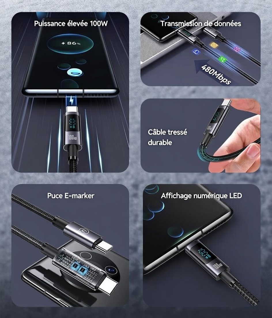 Câble de charge rapide et de transfert de données US-SJ671 USB-C vers USB-C 100 W en alliage d’aluminium avec affichage numérique – Série Sufeng 1,2 m