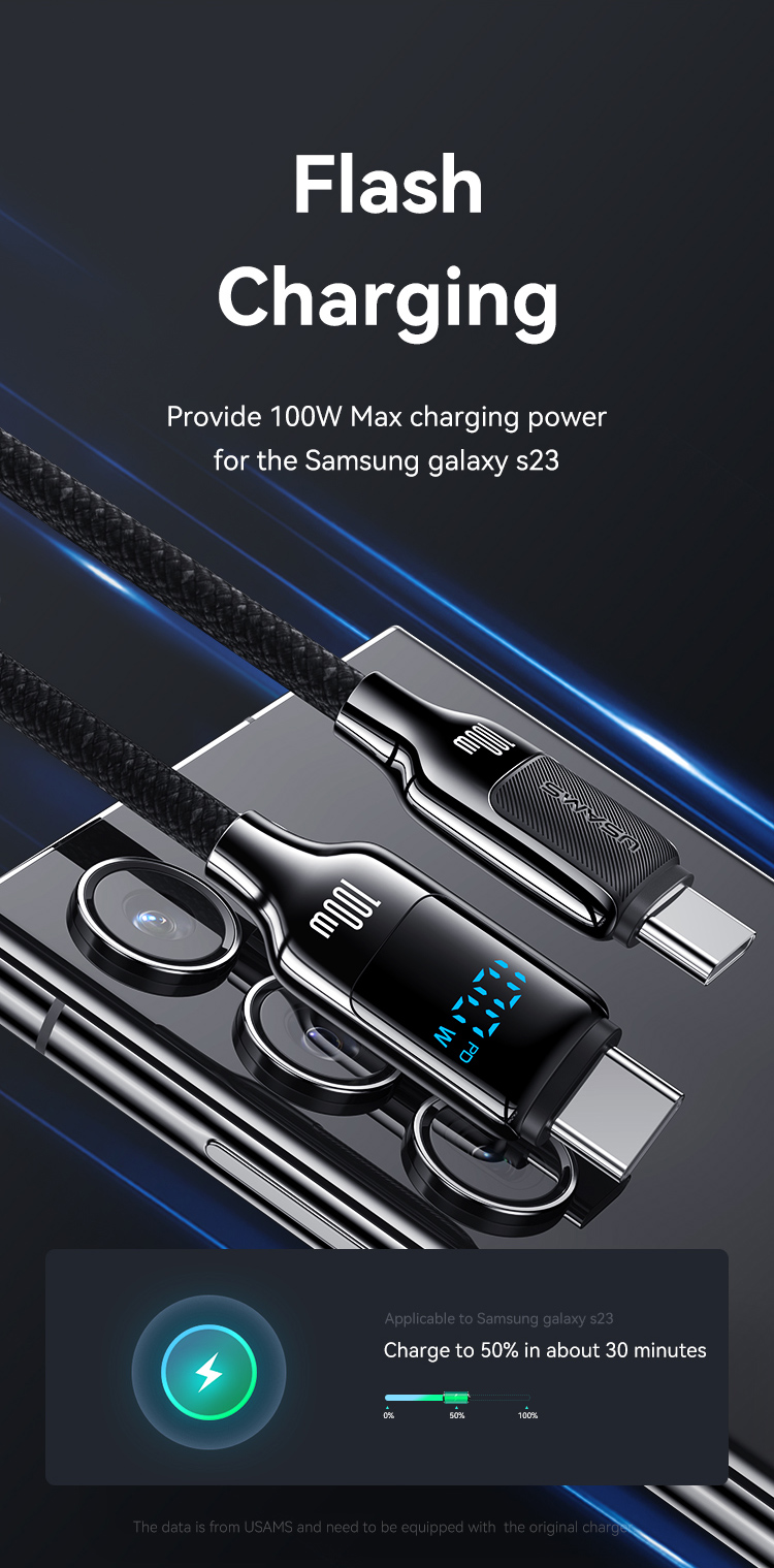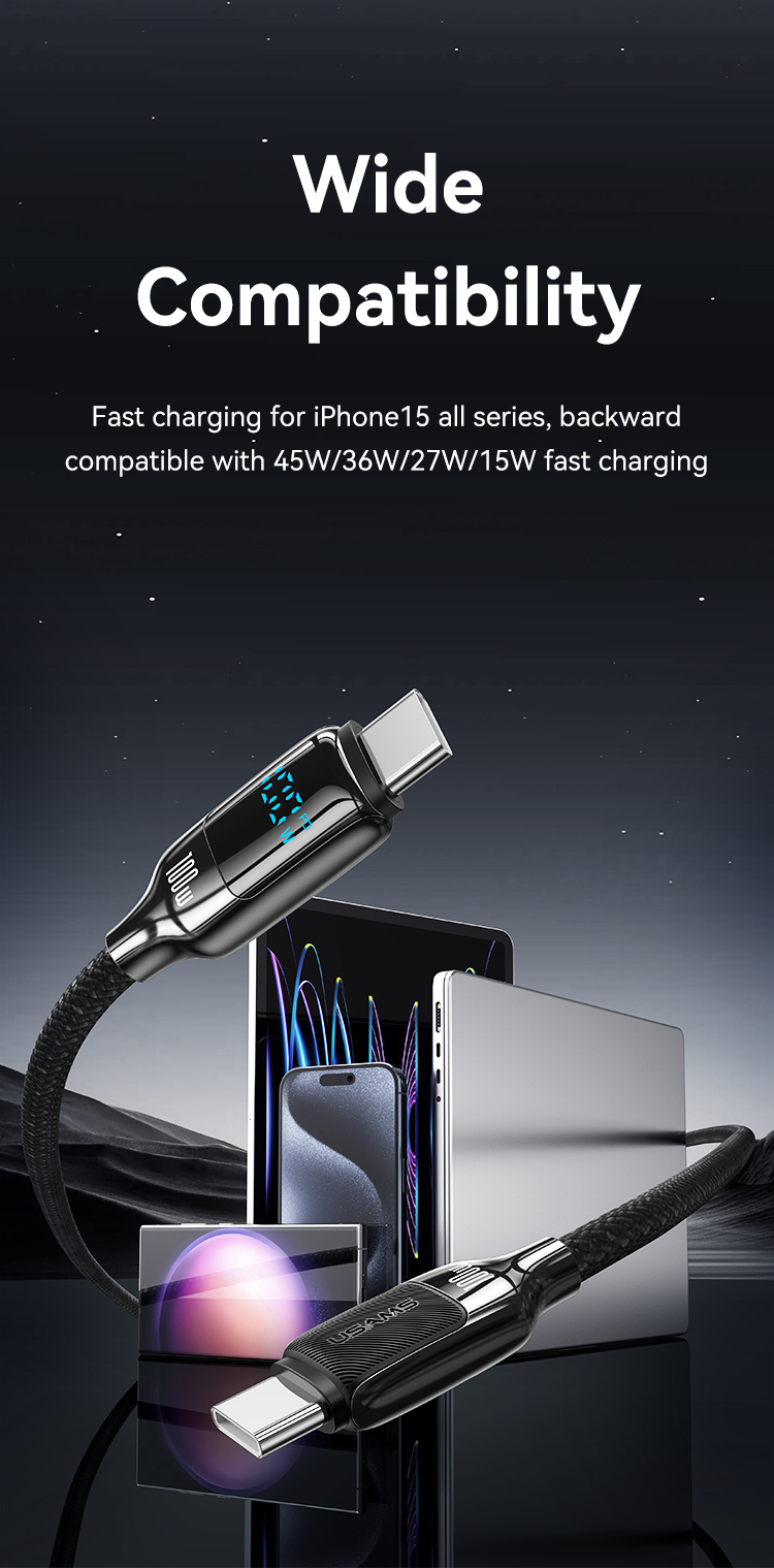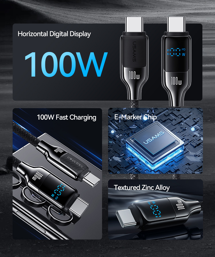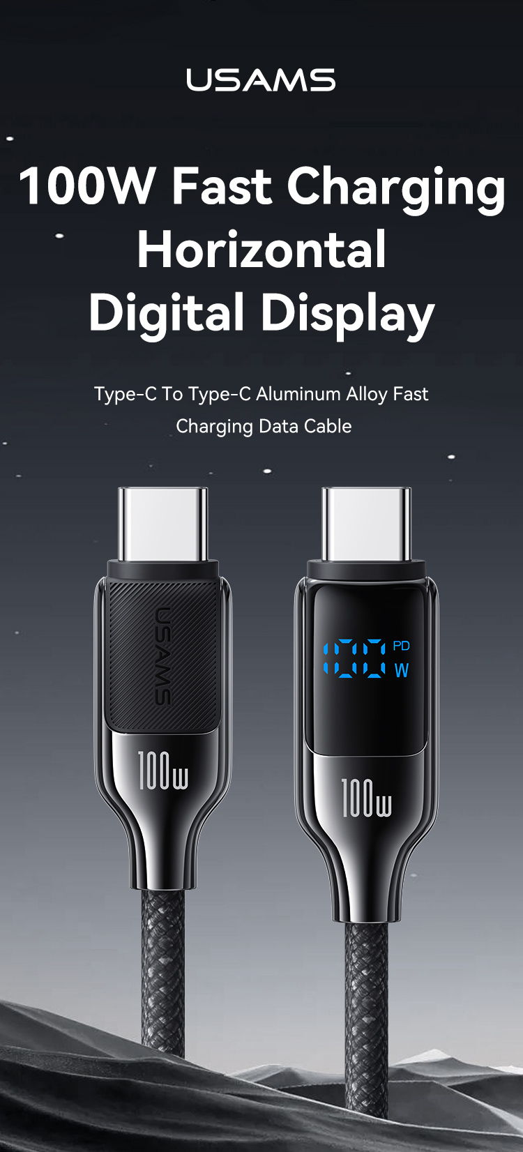 Câble de données de charge rapide 100 W en alliage de zinc avec affichage numérique, USB-C vers USB-C – Série HX 1.2m