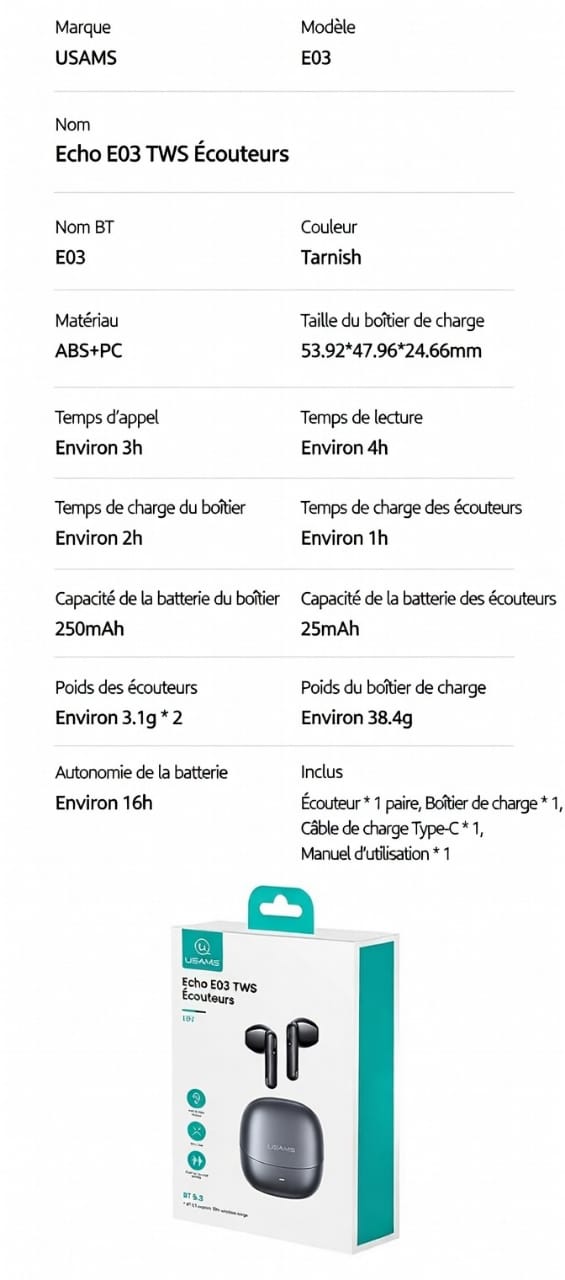 Autonomie en appel : Environ 3 h (utilisation simultanée des deux écouteurs)